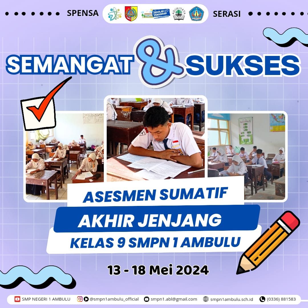 Info Sekolah PELAKSANAAN ASESMEN SEKOLAH AKHIR JENJANG SMP NEGERI 1 AMBULU 2024 Mulai hari Senin, 13 Mei 2024 sampai 6 hari ke depan, ... May 14, 2024