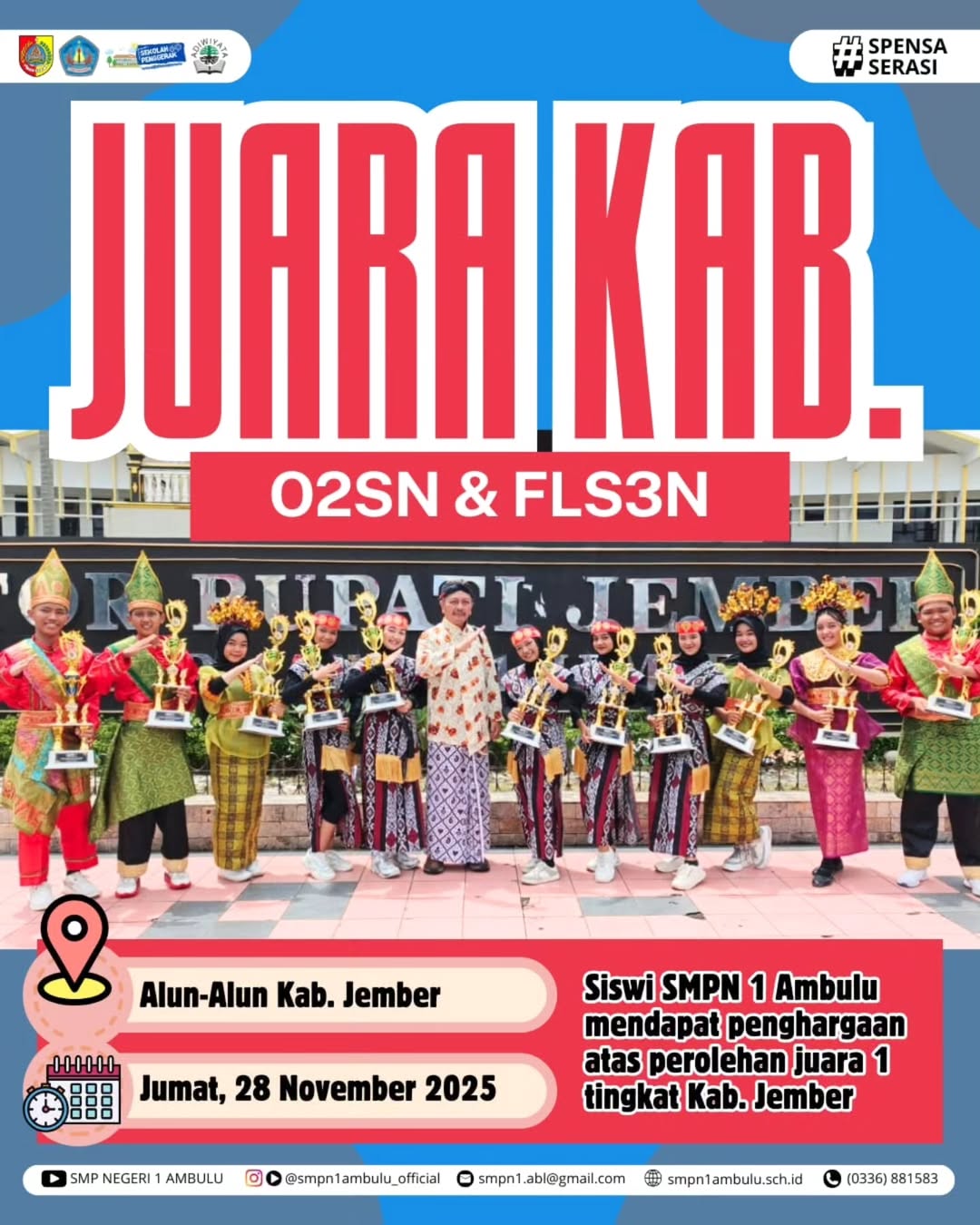 Prestasi demi prestasi kembali meledak dari panggung O2SN & FLS2N 2025! Tari Kreasi—MEWAH! Musik Tradisi—GAGAH! Karate—TAK TERBENDUNG! Siswa-siswi SMPN 1 AMBULU tampil tanpa ragu, tanpa takut, dan tanpa jeda! Kerja keras mereka akhirnya pecah jadi kemenangan yang mengharumkan nama sekolah dan dada kita semua! #SMPN1Ambulu #SpensaSerasi #PrestasiMenggelegar #JuaraKabupaten #FLS2N2025 #O2SN2025 #AmbuluBersuara #BanggaSpensa #JemberHebat #pelajarberprestasi