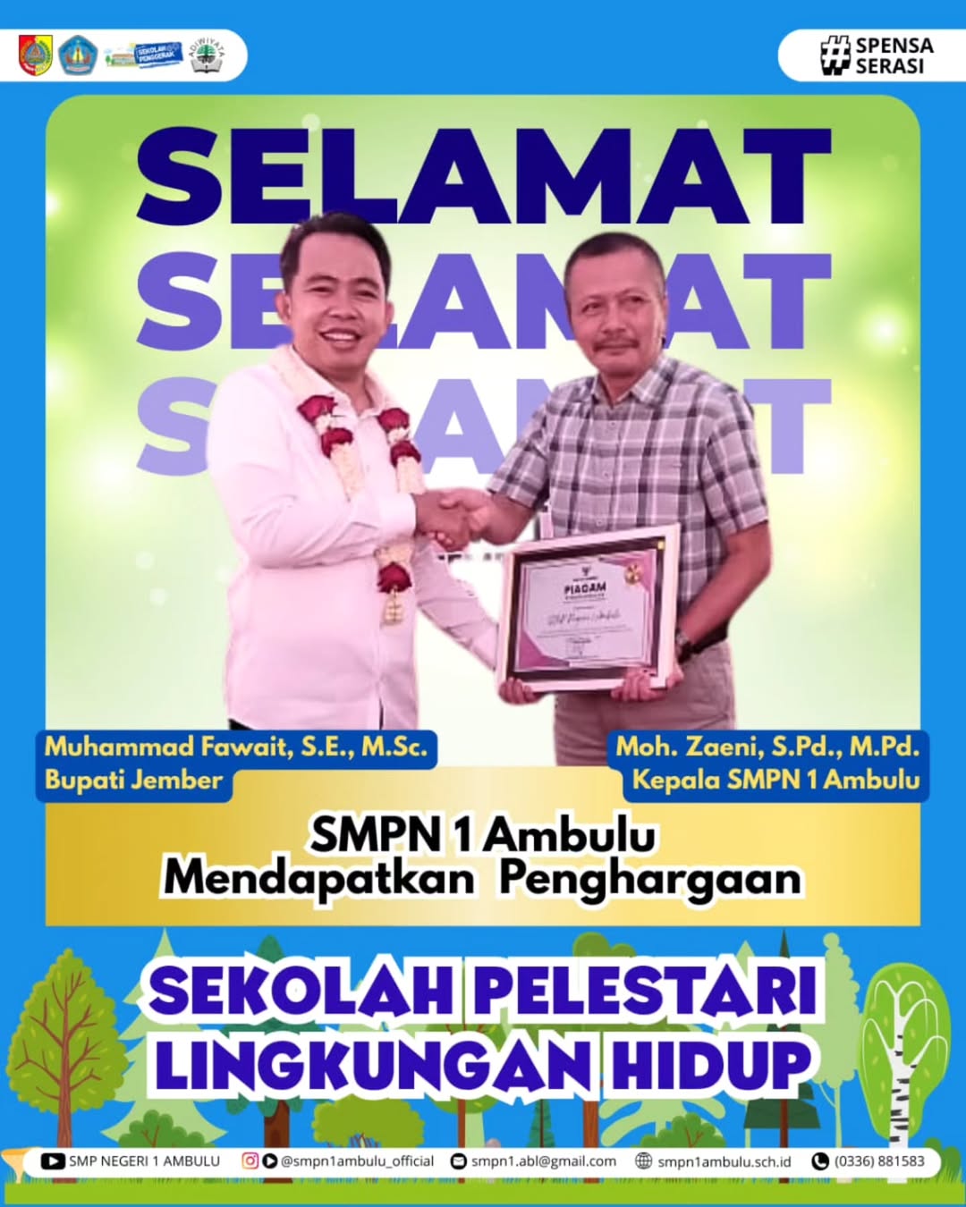 🌱✨ SELAMAT & BANGGA UNTUK SPENSA!✨🌱 SMPN 1 Ambulu kembali menorehkan prestasi membanggakan dengan meraih Penghargaan Sekolah Pelestari Lingkungan Hidup. Sebuah bukti nyata bahwa kepedulian terhadap lingkungan bukan sekadar slogan, tetapi telah menjadi budaya dan karakter sekolah. Terima kasih atas dukungan dan apresiasi dari Bapak Muhammad Fawait, S.E., M.Sc. (@gus.fawait )selaku Bupati Jember, serta dedikasi luar biasa dari Bapak Moh. Zaeni, S.Pd., M.Pd. selaku Kepala SMPN 1 Ambulu, beserta seluruh warga sekolah yang terus berkomitmen menjaga bumi melalui langkah-langkah kecil yang bermakna. Spensa terus melangkah. Mendidik dengan hati, merawat lingkungan dengan aksi nyata. 🌍💚 #SpensaSerasi #SMPN1Ambulu #SekolahPelestariLingkungan #Adiwiyata #SekolahHijau #PeduliLingkungan #BanggaSpensa
